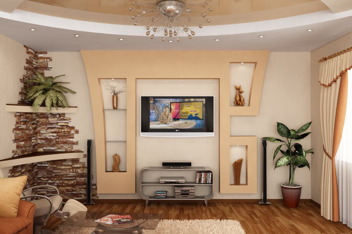 Изготовить полку для телевизора можно и из гипсокартона. Материал и готовое изделие из него обходятся недорого. Гипсокартон позволяет реализовывать любые идеи хозяина квартиры. Еще на стадии создания эскиза можно продумать специальную систему, скрывающую проводку и иные возможные коммуникации.