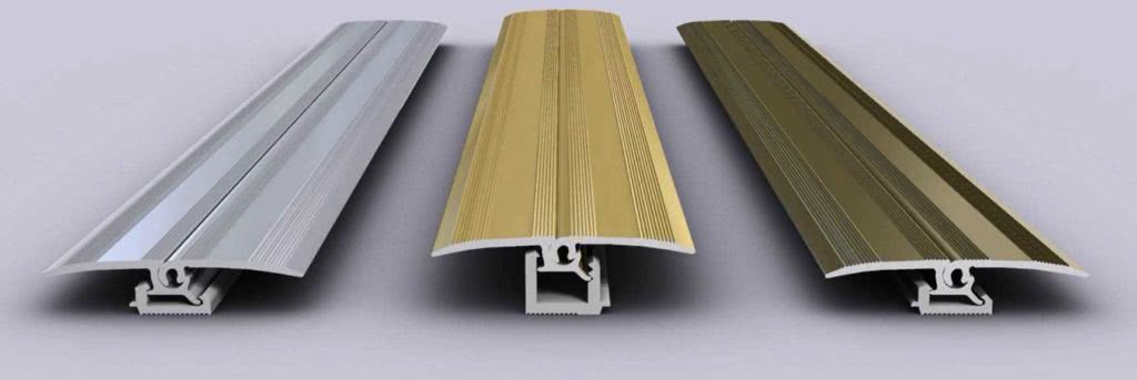Максимальная толщина пятьдесят миллиметров. Материал долговечный, прочный. Для внешнего вида можно применить любую цветовую палитру. Стоимость приемлемая, устойчив к влаге, мизерный уход, простой монтаж. Часто используемым материалом является алюминий. Он фиксирует различные напольные покрытия, повышает срок эксплуатации. Делится на одноуровневый, многоуровневый и угловой.