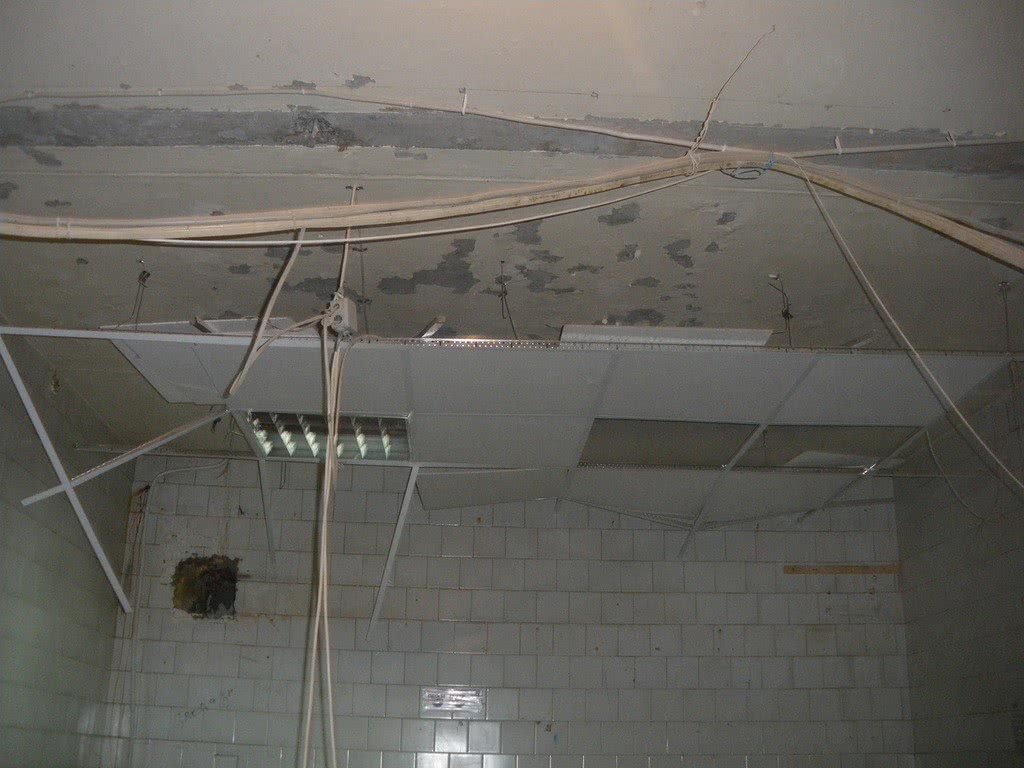 - Снять глухие потолочные плиты. Элементы не прикрепляются к каркасу, поэтому снимать их просто – приподнять деталь, повернуть по диагонали, вытащить.