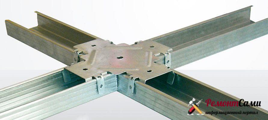 - По размеченным сторонам каждого квадрата монтируют перемычки. Вырезают из профиля отрезки такой длины, какая потребуется. Их скрепляют с продольными направляющими особыми крепежными деталями – «крабами». Указанные элементы способны объединить всю обрешетку в общую конструкцию. При этом нижний уровень будет точно выверен.