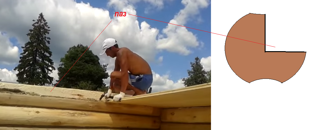 - Выделенные линиями участки бревен пропиливаются и затем выдалбливаются топором и зубилом. «Полка» должна быть настолько ровной, насколько это возможно.