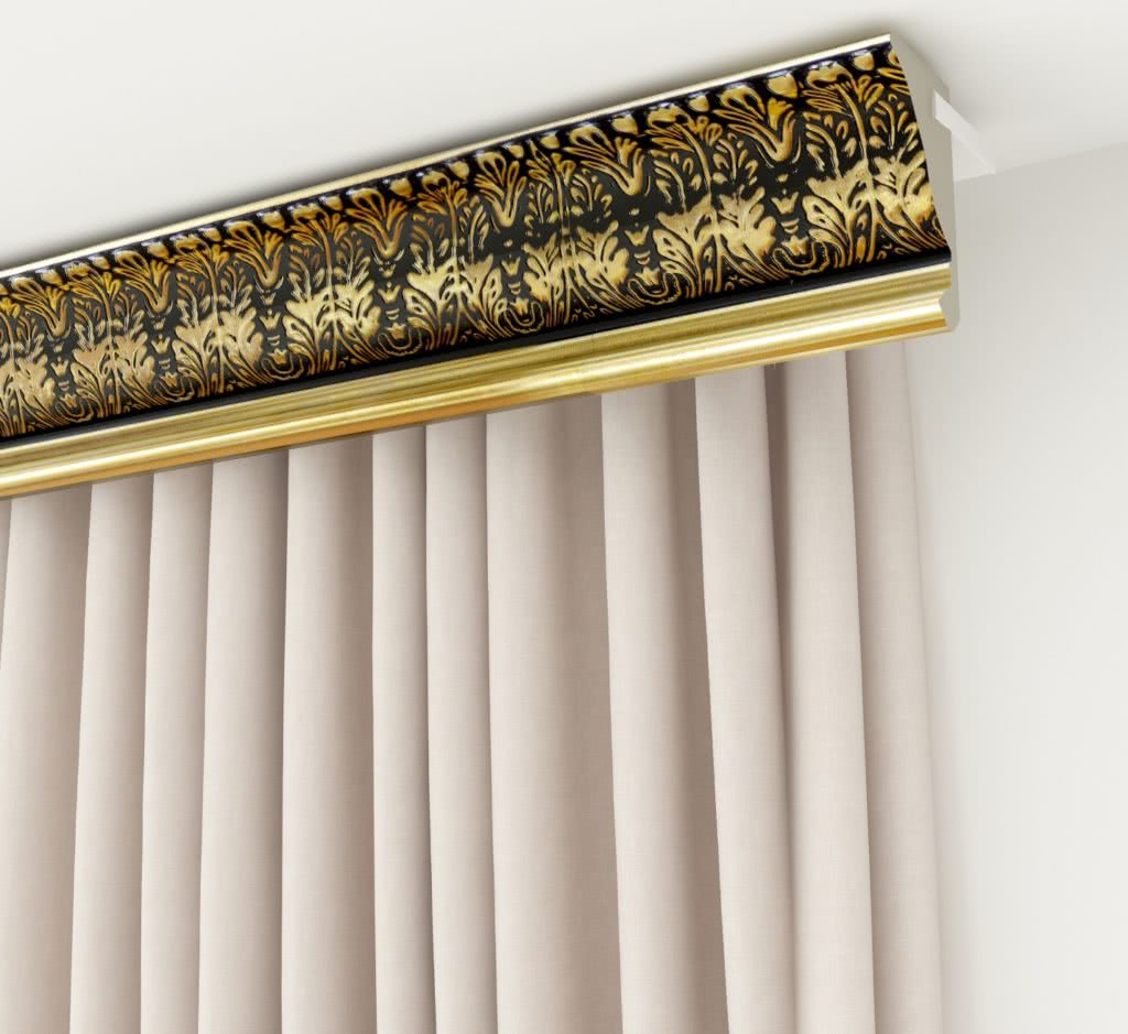 Такие конструкции скрывают основную часть, на которую крепятся шторы, под красивым багетным аксессуаром. Основа, на которую закрепляется материал, бывает металлической или алюминиевой. Такой тип можно назвать самым декоративным из всех перечисленных. Для украшения используют различные багетные узоры и резные рисунки.