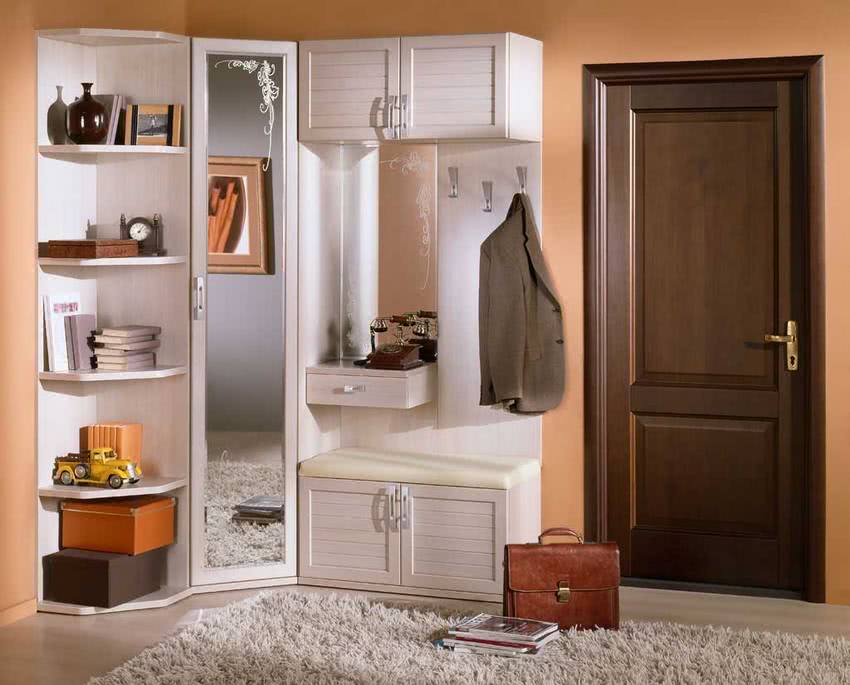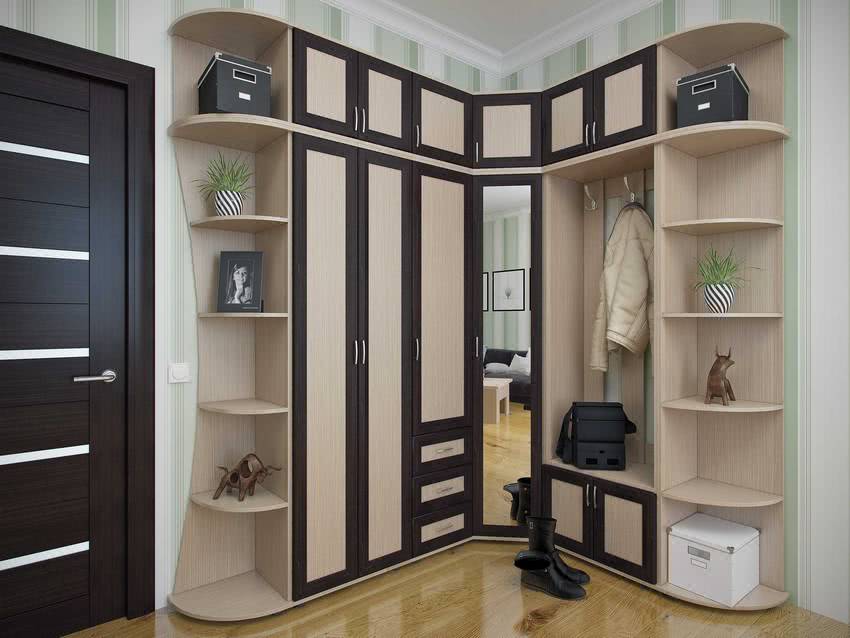 Другой случай – по углам расположить радиусные шкафы, у которых дверцы скруглены, а остаток места необходимо использовать для оборудования полок для хранения обуви.