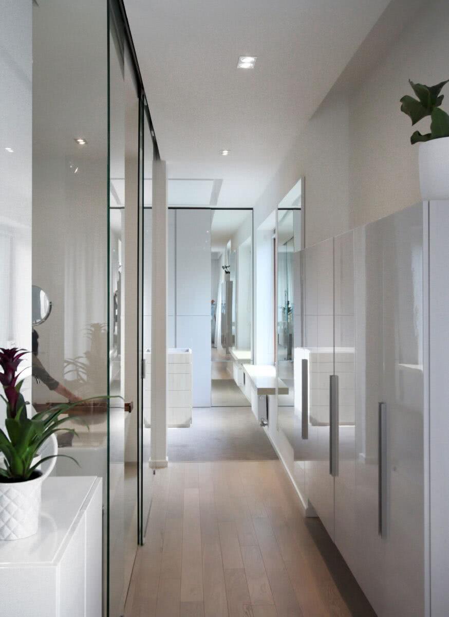 Тогда часть помещения у входной двери будет легче преобразовать в более просторную комнату. Здесь можно применить все методы визуального расширения прихожей, а шкафы для сезонной одежды останутся за ее пределами. Вдоль узкого коридора дизайнеры рекомендуют оформить гардеробную в виде встроенных шкафов за раздвижными дверцами. Часть одежды можно оставлять на вешалке за входной дверью, там же ставить обувь на многоуровневую полку, если есть такое место.