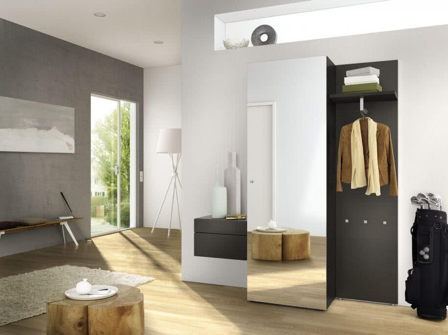 Для прихожей средних размеров подойдёт шкаф с раздвижными дверями, в среднюю секцию которого вмонтировано большое зеркало во всю высоту. В большой прихожей отлично встанут модули с распашными дверцами. При необычной планировке нужно искать угловые модули, позволяющие продуктивно использовать пустующие углы.