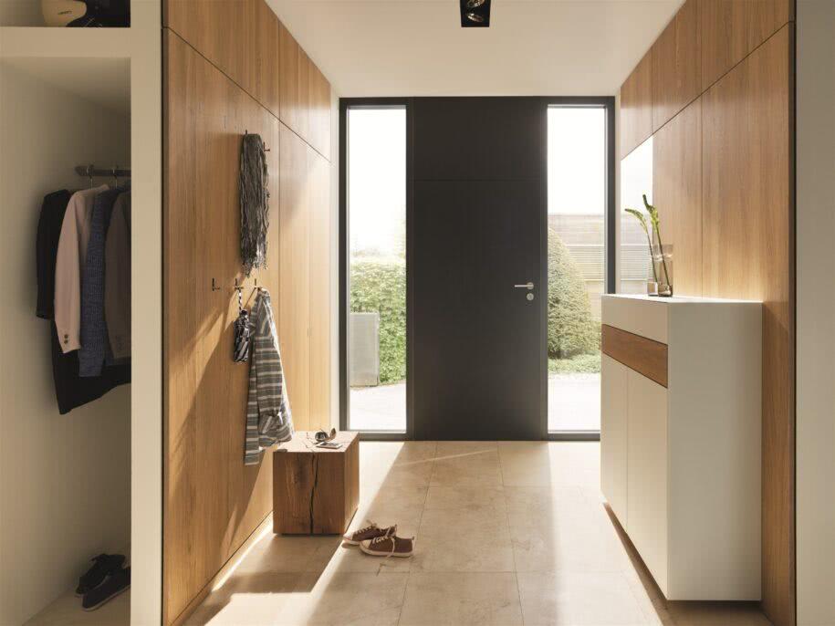 А теперь представьте деревянную дверь, справа от которой, прямо рядом со входом, у вас есть ниша с сиденьем в форме куба, над которым обшиты стеганые стенные панели, доходящие до верхнего шкафа, свисающего с потолка. С этой стороны у вас только минималистичные встроенные шкафы без ручек на всю стену. На левой стороне двери, в свою очередь, находится шкаф, на котором можно убрать ключи. Добавим, что упомянутое сиденье и панели имеют теплый серый цвет и в этом оттенке (чуть светлее) присутствуют напольная плитка, шкафы и шкаф.