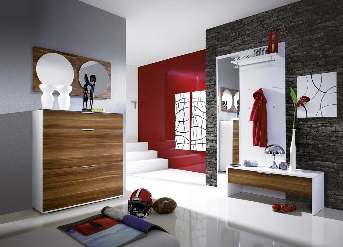 Если вам по душе более яркие и насыщенные вариации оттенков, то в создании современного дизайна для прихожей можно использовать одновременно до трёх цветов «с характером», к примеру, белый, красный и чёрный. Их можно внедрить в нейтральную гамму или использовать для монохромных решений. Оформление дизайна в естественной гамме подразумевает наличие в интерьере оттенков, встречающихся в природе. Это может быть цвет каменной поверхности, один из вариантов древесных оттенков, зелень листвы, цвет морской волны, песка либо оттенок обожжённой глины. Примеров и вариаций исполнения в этом случае великое множество.