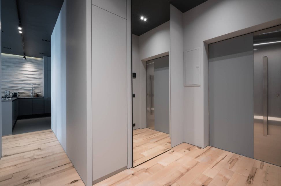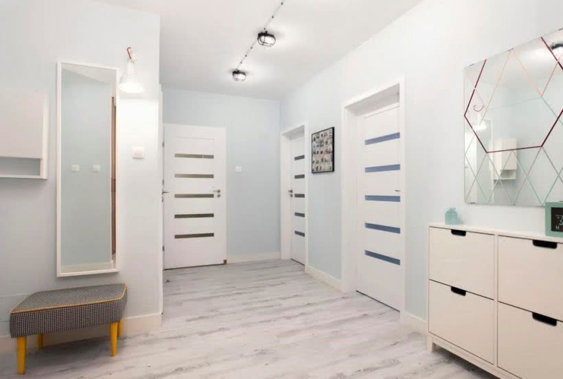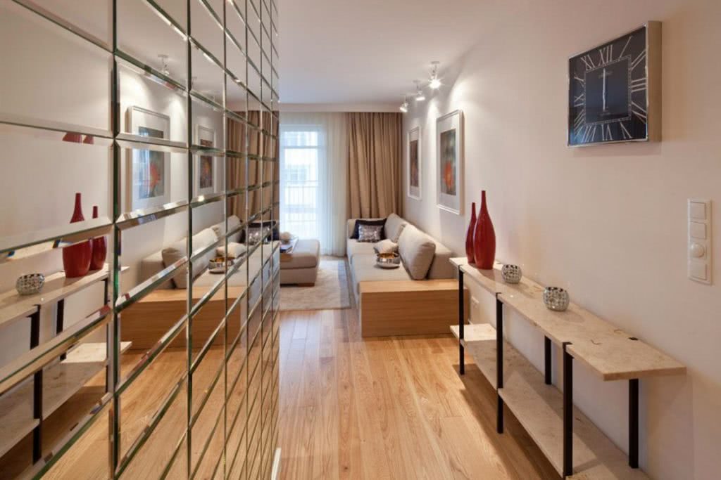 Тогда часть помещения у входной двери будет легче преобразовать в более просторную комнату. Здесь можно применить все методы визуального расширения прихожей, а шкафы для сезонной одежды останутся за ее пределами. Вдоль узкого коридора дизайнеры рекомендуют оформить гардеробную в виде встроенных шкафов за раздвижными дверцами. Часть одежды можно оставлять на вешалке за входной дверью, там же ставить обувь на многоуровневую полку, если есть такое место.