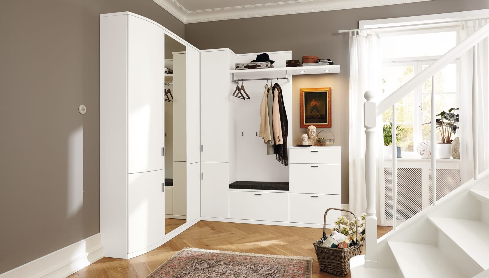 Классический вариант, позволяющий наиболее комфортно и практично разместить и детали гарнитура, и вспомогательную мебель (полочки для обуви, крючки для зонтов, вешалка для сушки верхней одежды). Для оформления подходит абсолютно любой стиль дизайна и цветовая гамма.