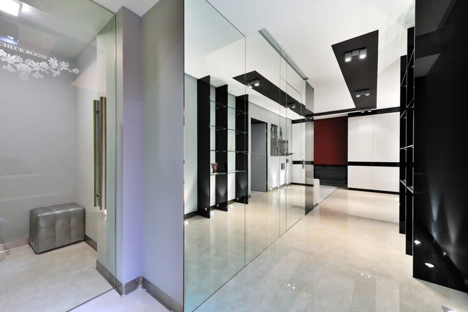 Большие прихожие в частном доме могут быть выполнены в любом современном стиле с использованием встроенной мебели. Большие, стильные гардеробные позволяют экспериментировать с цветом, дизайном. Шкаф с глянцевой поверхностью с зеркалом позволит зрительно увеличить пространство, добавить света. Для усиления эффекта на шкаф следует направить небольшие светильники.