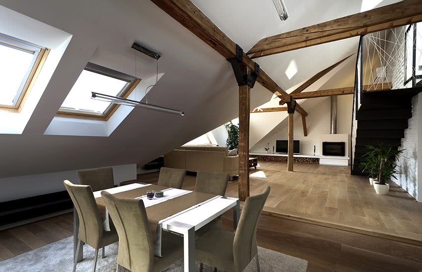 Мансарда может выступать в роли гостиной, кабинета или спальни