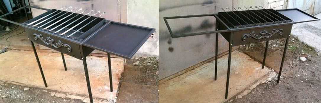 Ну, и если делаете мангал для себя, своими руками, может имеет смысл предусмотреть для комфорта столешницу и/или раму для укладки шампуров, как на фото ниже. Жаровня по верхнему краю усилена профильной трубой. Усиление сварено так, чтобы можно было вставлять «дополнения». Так что и столик и подставка под шампура — может вставляться или нет по желанию.