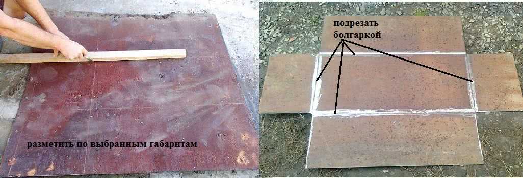 Его можно использовать если у вас есть достаточно большой кусок металла, на котором поместится вся «развертка». В этом случае размечаете все выясненные выше размеры, вырезаете «лишние» углы. Потом места сгиба аккуратно подрезаете болгаркой: легче будет сгибать.