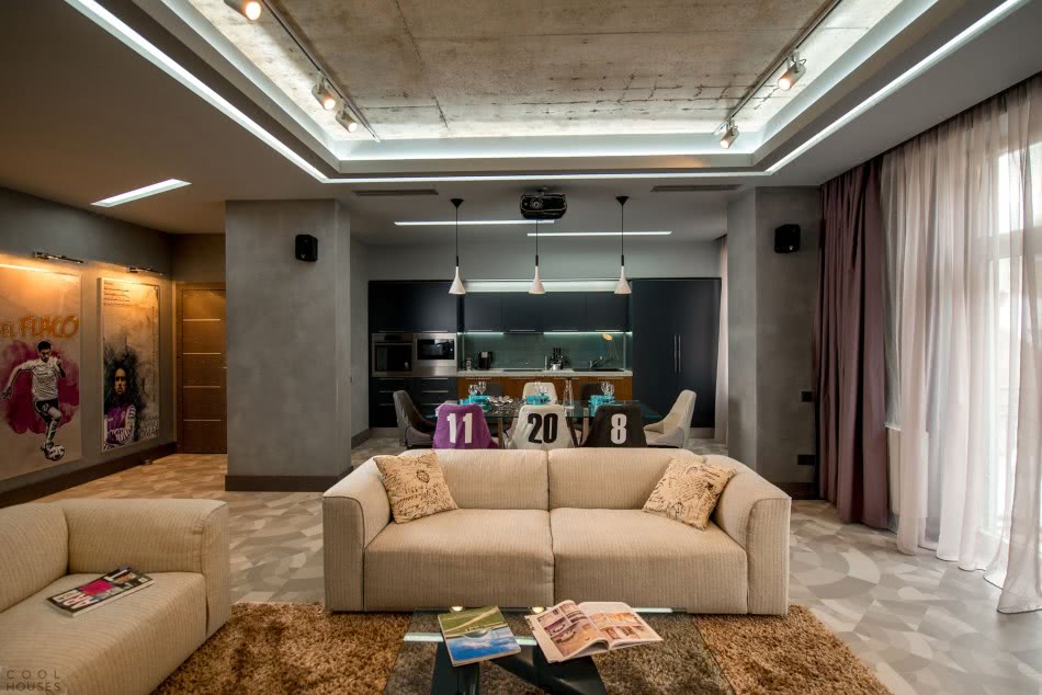 - Внутри помещения стоит ставить минимум перегородок, таким образом, чтобы общая площадь была объединена. Примером являются проекты небольших жилых помещений, таких как квартира студия. В рассматриваемом варианте группируются внутренние помещения (гостиная, кухня, спальня), а разделение между ними происходит при помощи дизайнерских методов (элементов декора).