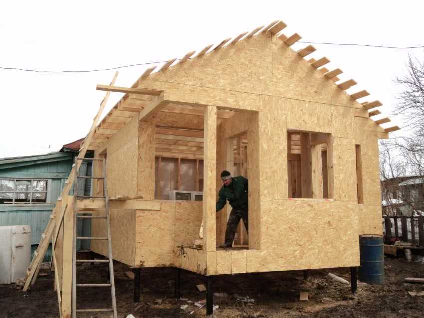 - ОСП-панели на каркасе. Поверх основания выстраивают остов коробки и стропильной системы из бруса или бревна. Наружные стены зашивают панелями. Изнутри укладывают утеплитель (пенопласт, вату), закрывают пароизоляцией, обшивают фанерой или доской с пазами.