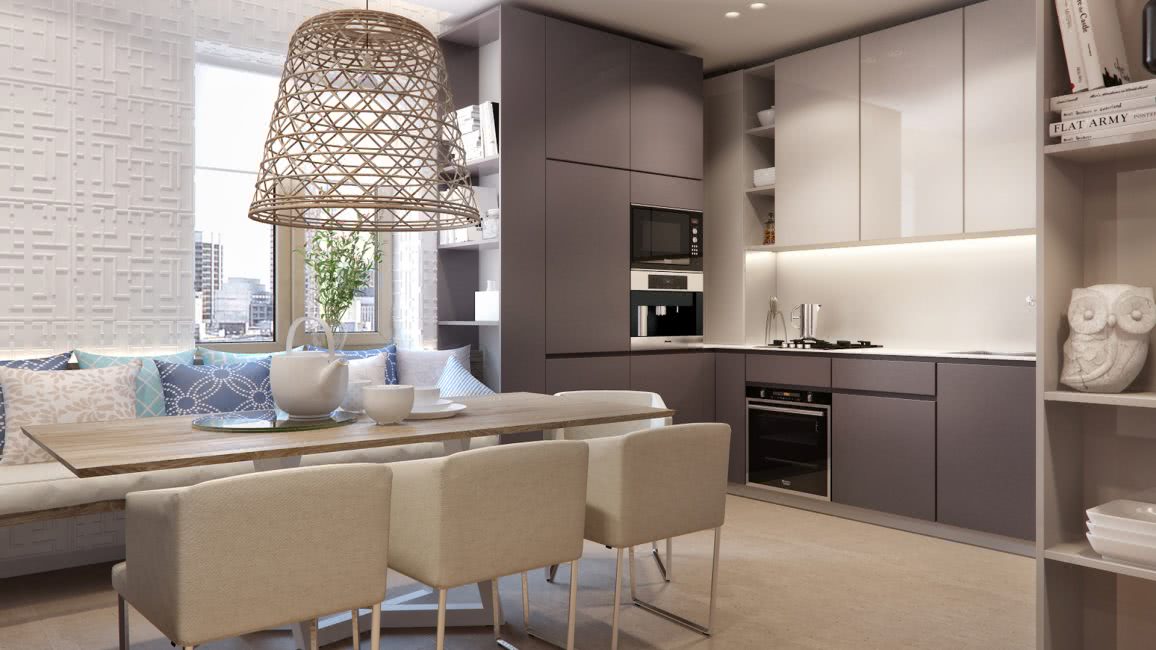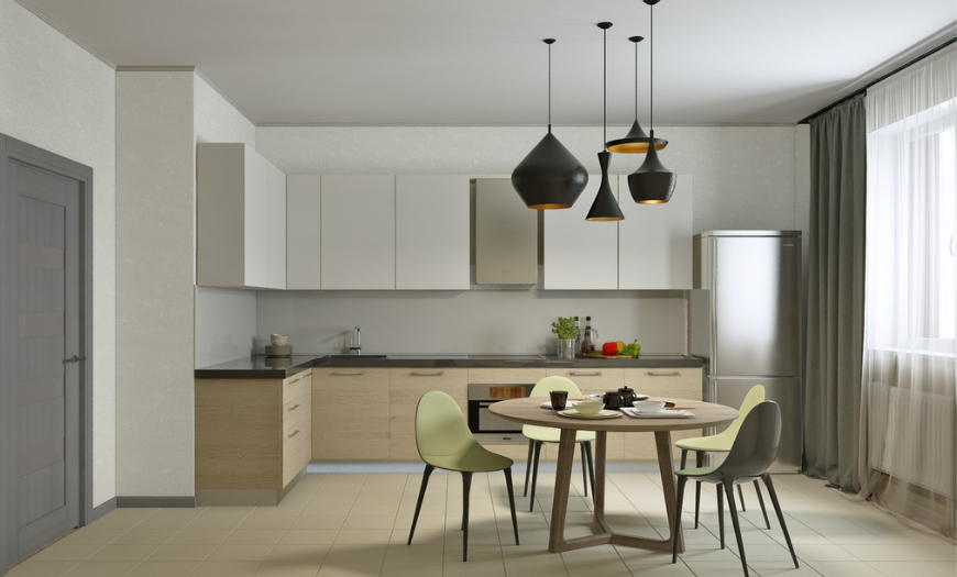 Обеденную зону устанавливают в углу возле окна или у свободной стены, это зависит от планировки и площади кухни. В качестве обеденной группы используют кухонные уголки, диваны и софы, табуретки, стулья и скамьи. Для небольшой кухни выбирают квадратные или прямоугольные столы, для просторных — овальные или круглые. Если семья состоит из 2-3 человек, вместо стола используют барную стойку.