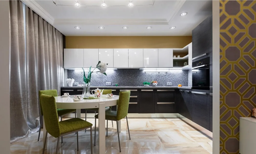 Когда окна комнаты выходят на солнечную сторону, кухонный гарнитур такого помещения может быть: