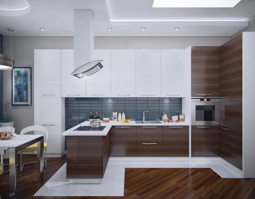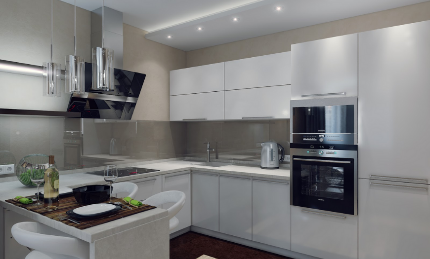 Объединение нескольких помещений дает немалую свободу для выбора мебели. С помощью угловых вариантов проще организовать зонирование. В домах и квартирах большой площади угловая кухня совмещается с барной стойкой.