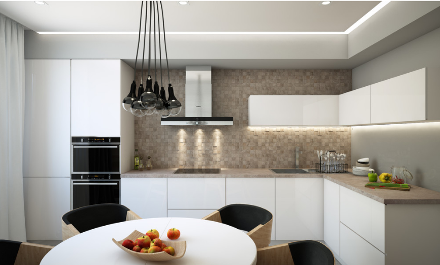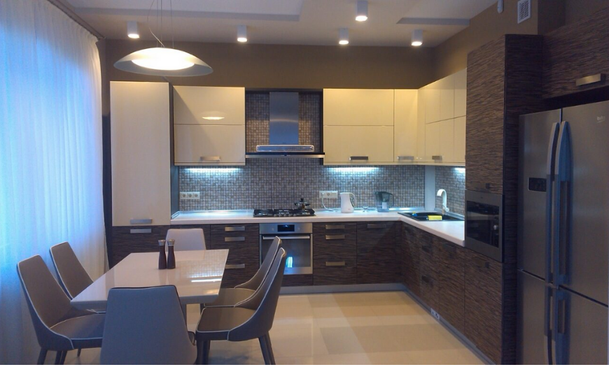 Как только установлен последний элемент (карниз наверху шкафчиков), пора сделать качественную подсветку. Обычно это точечные светильники, расположенные на козырьке. Свет нужен над плитой и рабочей поверхностью, эти зоны должны быть освещены лучше всего. При необходимости можно установить подсветку внутри самих шкафчиков.