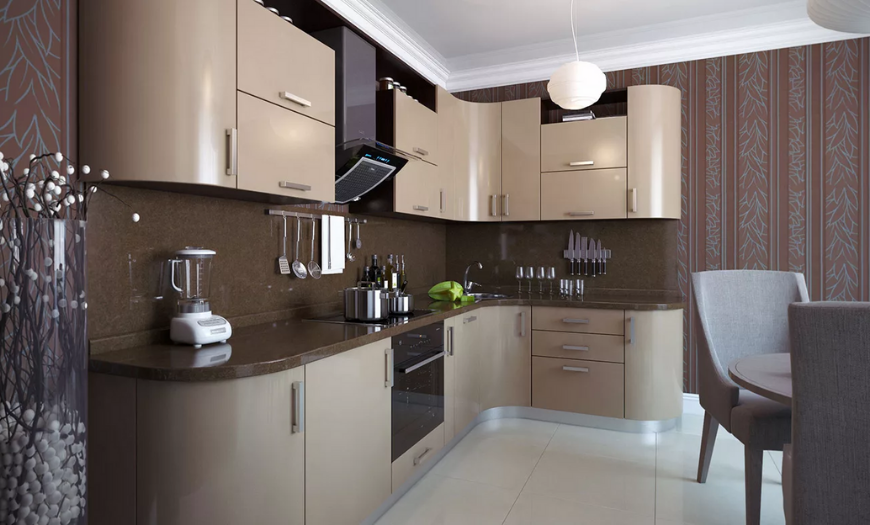 Угловая кухня популярна при благоустройстве интерьера. Подходит для маленькой площади. Гарнитур дополняют островом, рядом вместительных шкафов вдоль противоположной стены. Дизайн, подразумевающий применение скошенного угла, хорош при угловой мойке.
