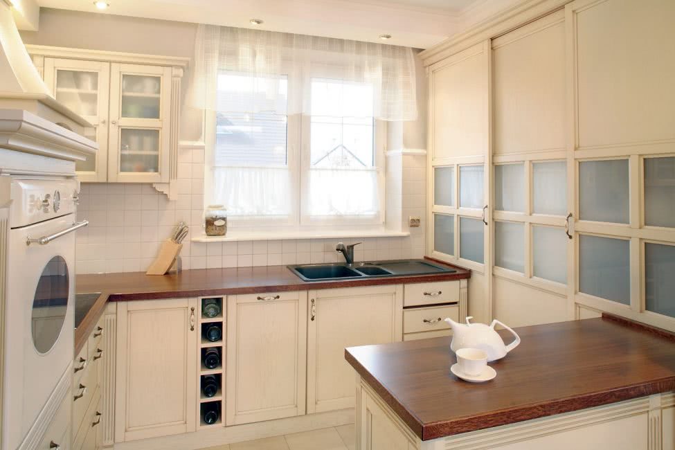 Главное, при размещении учитывать рост хозяйки: если она невысокая, то и навесные шкафы не устанавливают под потолком, а опускают на 10-15 см ниже. В противном случае придется каждый раз взбираться на табуретку, чтобы дотянуться до верхней полки шкафа и достать нужные продукты или бытовые принадлежности.