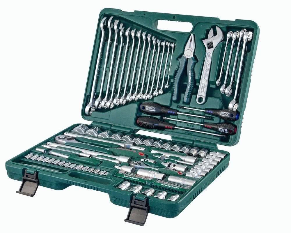 Универсальный набор, состоящий из 127 предметов, включает: столярно-слесарные инструменты первой необходимости (молоток, вороток, трещотку, плоскогубцы, бокорезы, гаечные, торцевые ключи и пр.).