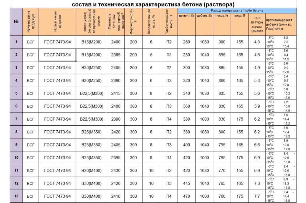Таблица: сравнение характеристик марок бетона для уличной отмостки и садовых дорожек