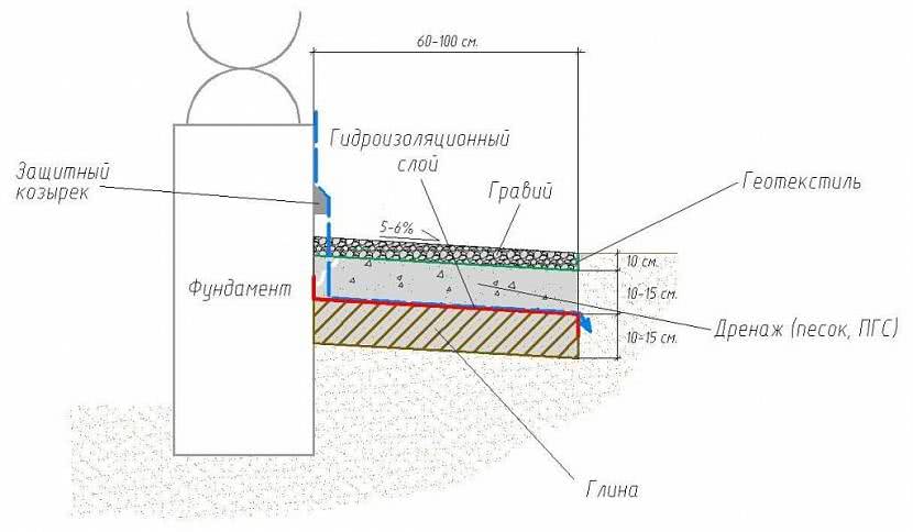 - Минимальная ширина: 1 м для 1 кл. грунтов, 2 м — для 2 кл. на 200 мм от вылета козырька. Для плоских крыш — минимальное значение должно быть 500 мм от стены.