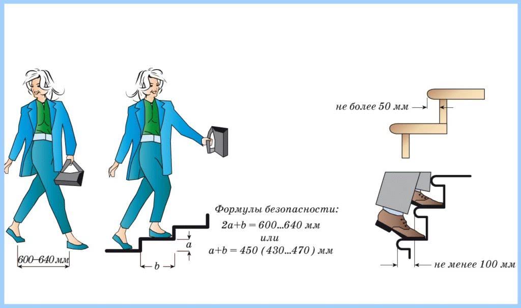В том случае если эта величина будет нижеуказанной, возникнут сложности при спуске по лестнице. При увеличении значения есть вероятность, что человек собьется с привычного шага и тем самым будет испытывать дискомфорт.