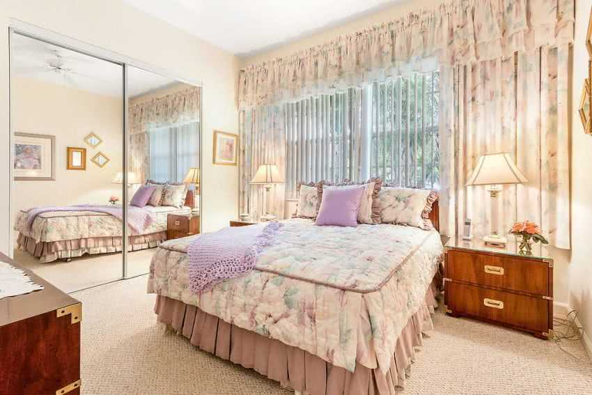 Здесь важную роль играет текстиль: над кроватью вешается элегантный балдахин, постель застилается покрывалом с воланами, рюшами или кружевными вставками. Сверху покрывала укладываются многочисленные декоративные подушки.