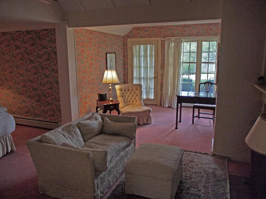 В набор мебели для гостиной, кроме дивана и кресел, включается стол (лучше круглый) в окружении изящных стульев, массивный буфет или комод, открытые шкафчики и этажерки на ножках. Интерьер не ухудшится из-за кресла-качалки, плетеных стульев и кресел из ротанга. Мебель расставляется свободно, симметрия не соблюдается.