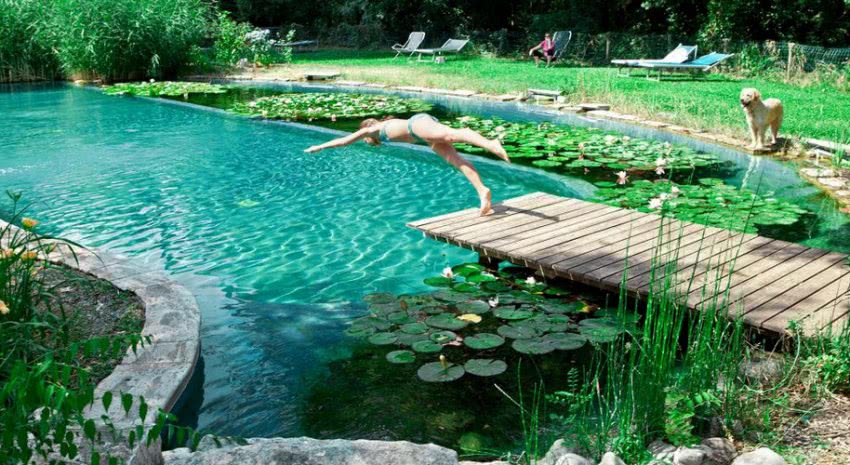 Первая разновидность хорошо впишется в ландшафт крупногабаритного участка. Для очистки воды в таком пруду выполняют биологические организмы (растения, зоопланктон и пр.). Большую часть такой конструкции будут занимать именно отделы с природными фильтрами. На зоны бассейн водоёма не делится и не предполагает использования сложных технологических приспособлений. Его плюсом является максимальная естественность.