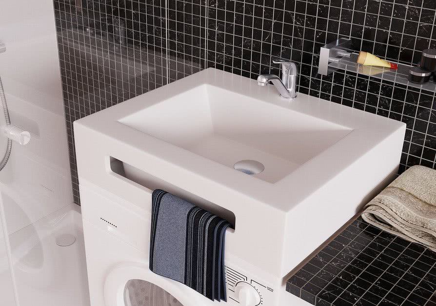 Для максимально рационального использования места, можно сделать встраивание конструкции из стиральной машины и раковины в специальную тумбочку. Такой вариант образует столешницу, на которой можно расставлять без проблем предметы личной гигиены, а в самой тумбе держать прочие химические средства.