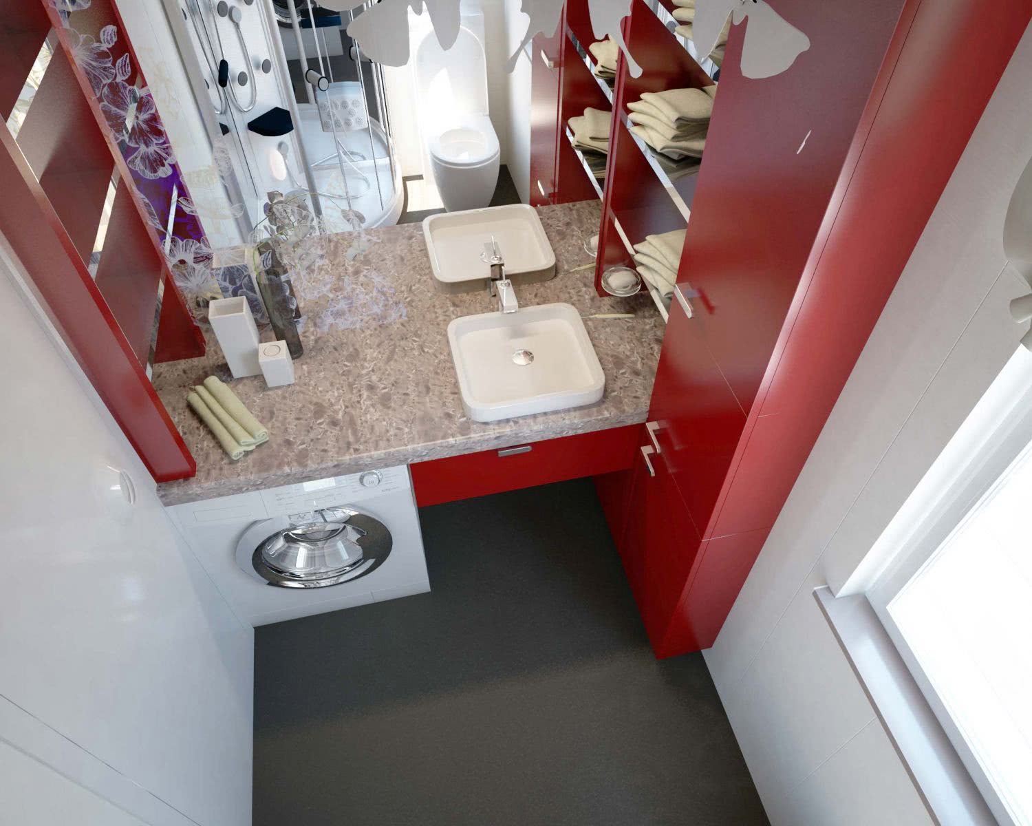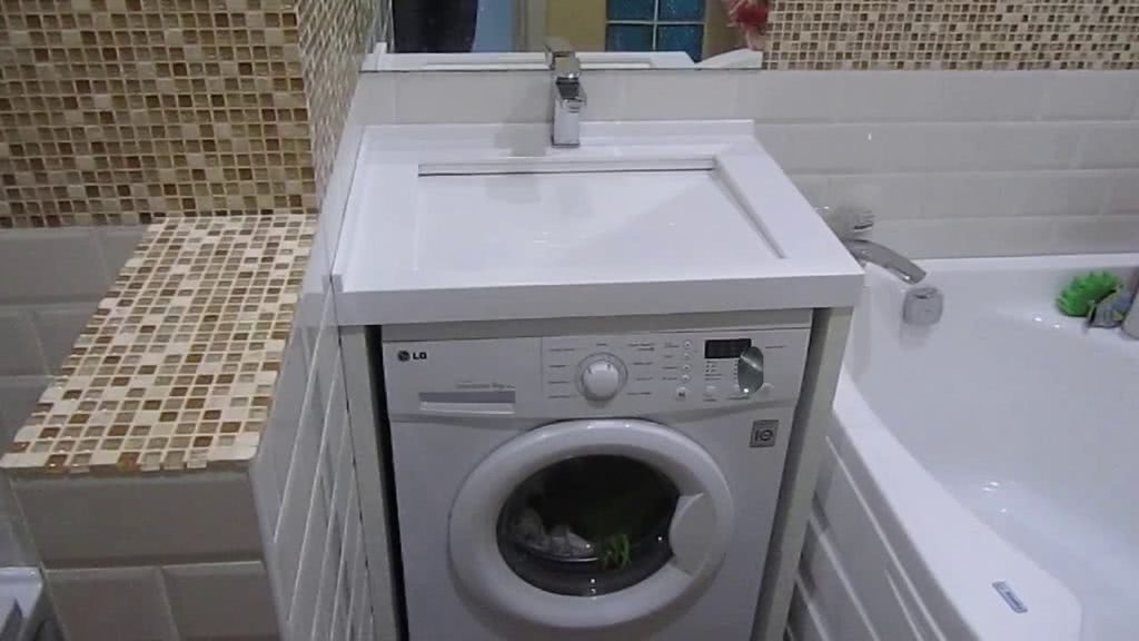 Для максимально рационального использования места, можно сделать встраивание конструкции из стиральной машины и раковины в специальную тумбочку. Такой вариант образует столешницу, на которой можно расставлять без проблем предметы личной гигиены, а в самой тумбе держать прочие химические средства.