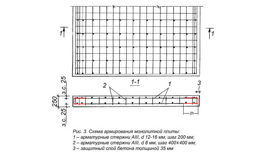 R – Число рядов арматуры. Классическая схема армирования предполагает установку двух рядов арматуры, при этом нижний ряд арматуры работает на растяжение, верхний – на сжатие. Полезные рекомендации касаемо расчета армирования можно почерпнуть из СП 63.13330.2012.