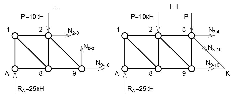 Проведём сечение I-I (рис. 5) и отбросим правую часть. Заменим стержни растягивающими усилиями. Просуммируем силы по осям: