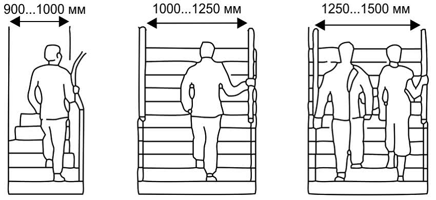 Для различных зон комфорта существуют различные стандарты ширины лестницы:
