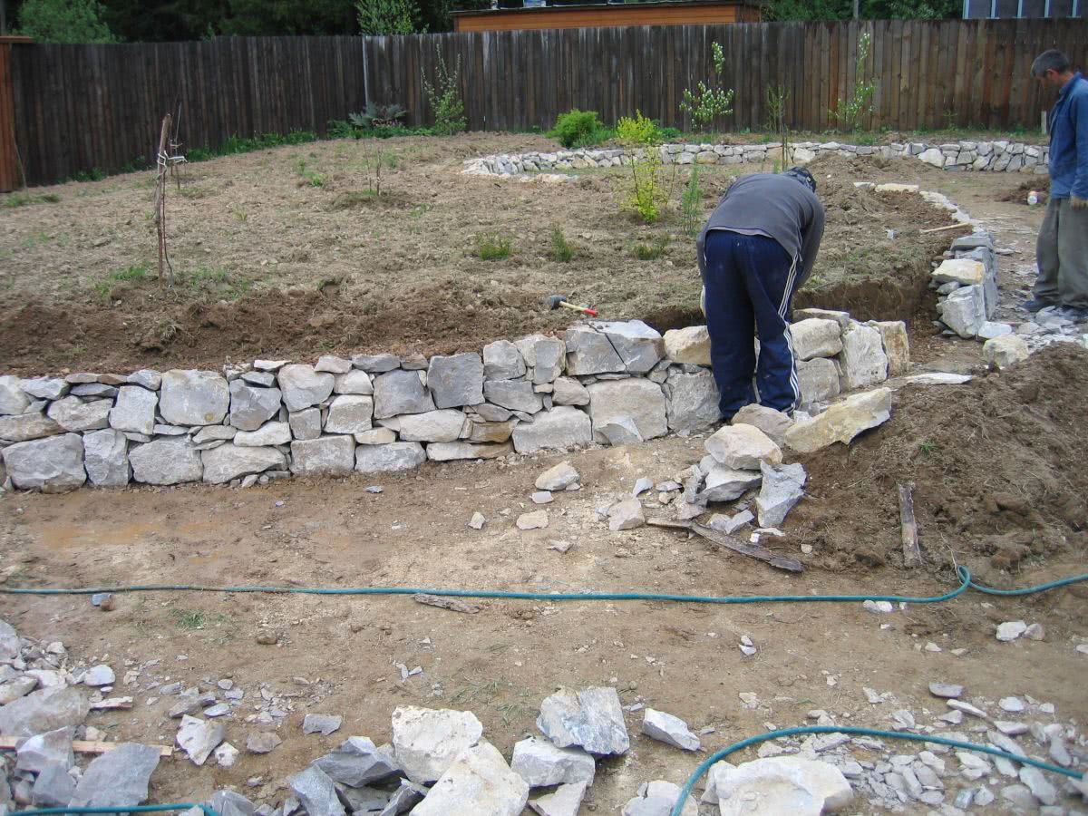 Начинается работа с дренажа и фундамента – первоначальных слоев, которые укладываются в специально вырытую траншею по линии хода стенки. После заливки усиленного фундамента (сойдет для этого и строительный мусор – арматура, проволока, гнутые электроды, прочее) поверх него укладывается натуральный камень. Чаще всего, это кварцит, гранит, диабаз и прочие породы, которые наиболее для данного процесса подходят.