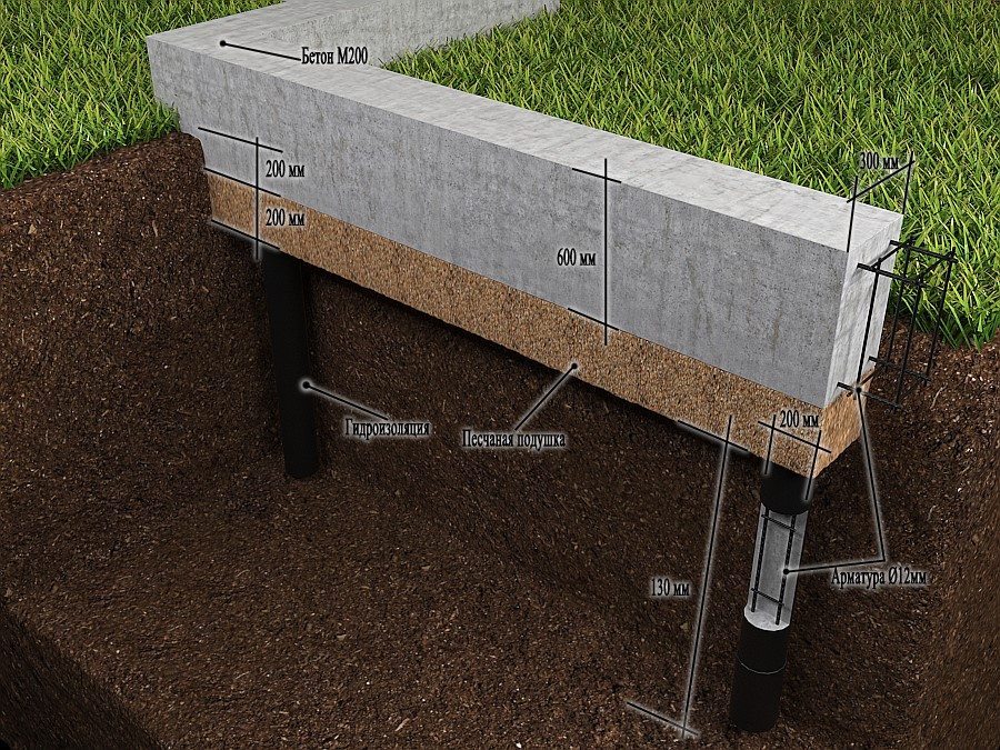 В большинстве случаев ростверк имеет сечение 400×300 мм. Для изготовления бетона используется цемент М200 и 300. Для армирования применяются прутья А2 и 1 Ø10-15 мм.