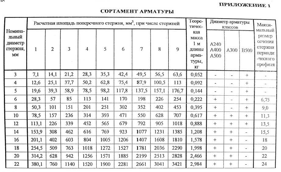 В качестве материала для армирования выбирают пруты класса А400 (Alll). Максимально допустимый диаметр рабочих прутов — 40 мм. Минимальные значения приведены в таблице.