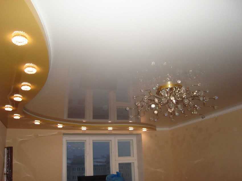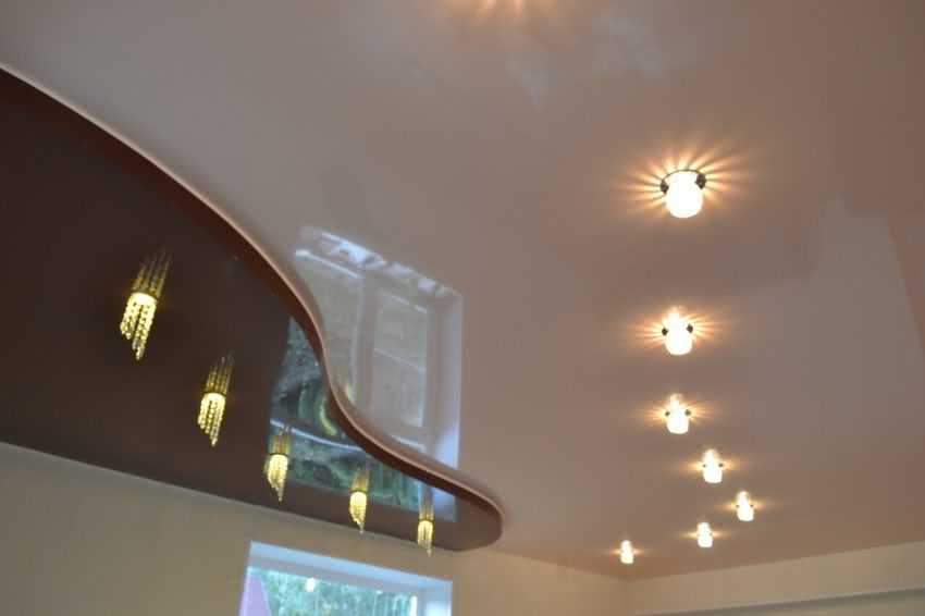 Особенности монтажа натяжных потолков не позволяют добавлять или убирать лишние лампы после установки. Проект должен быть точно рассчитан и оставаться без изменения до замены самого натяжного потолка. На таких потолках чаще устанавливают споты — точечные устройства с поворотным механизмом. Для установки приборов монтируются закладные платформы.