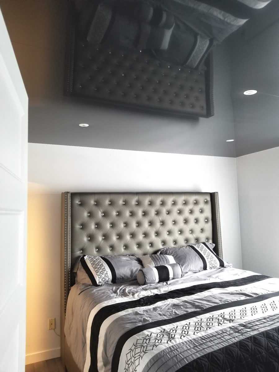 Глянец визуально увеличивает площадь комнаты, поэтому является оптимальным выбором для маленьких компактных спален. Придать воздушность конструкции позволит подсветка в виде точечных устройств или светодиодной ленты. Чаще всего они располагаются по контуру покрытия и дополняются бра, встроенными в стену у изголовья кровати или настольными лампами.
