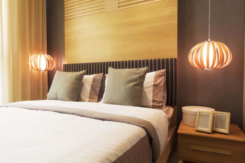 - Экономия места на тумбочках. Использование подвесных светильников освобождает место на прикроватной мебели для необходимых вещей, которые нужно иметь под рукой у кровати. А также избавляет от необходимости использования настольных ламп.