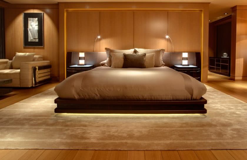 При составлении проекта учитывают обязательно как максимальную, так и минимальную яркость. Даже когда включен только ночной приглушенный свет, должен быть хорошо виден общий силуэт людей и обычных предметов, которые расположены в спальной комнате. Для создания основной части светового потока можно использовать различные приборы.
