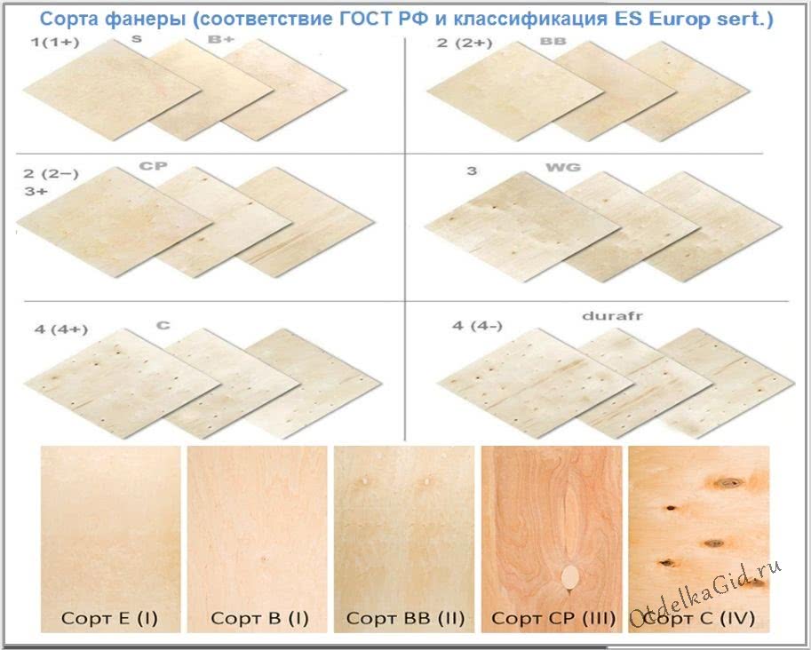 Выделяют 5 категорий качества фанеры. Элитный не используется при устройстве полового настила, поэтому для работы выбирается один из следующих вариантов: