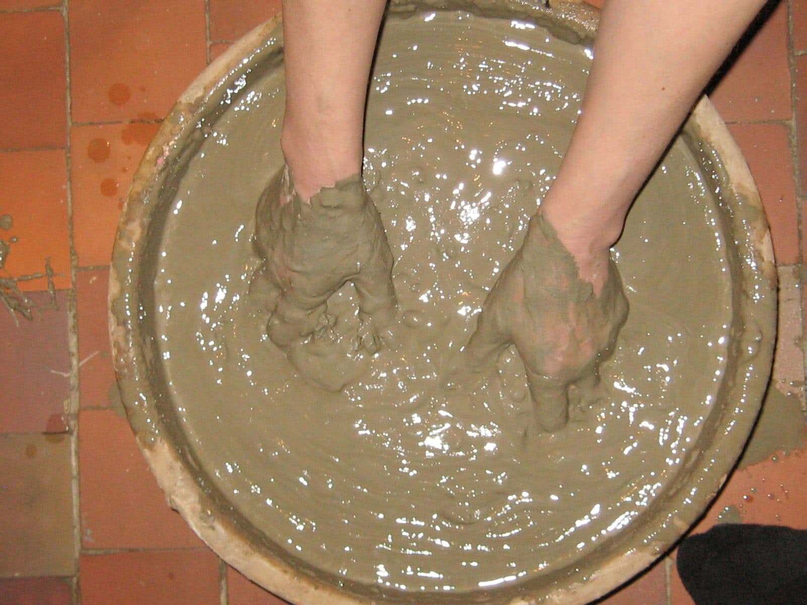Когда глина дойдет до нужной кондиции, ее перемешивают с тремя частями опилок и постепенно доливают в получившуюся смесь воду.