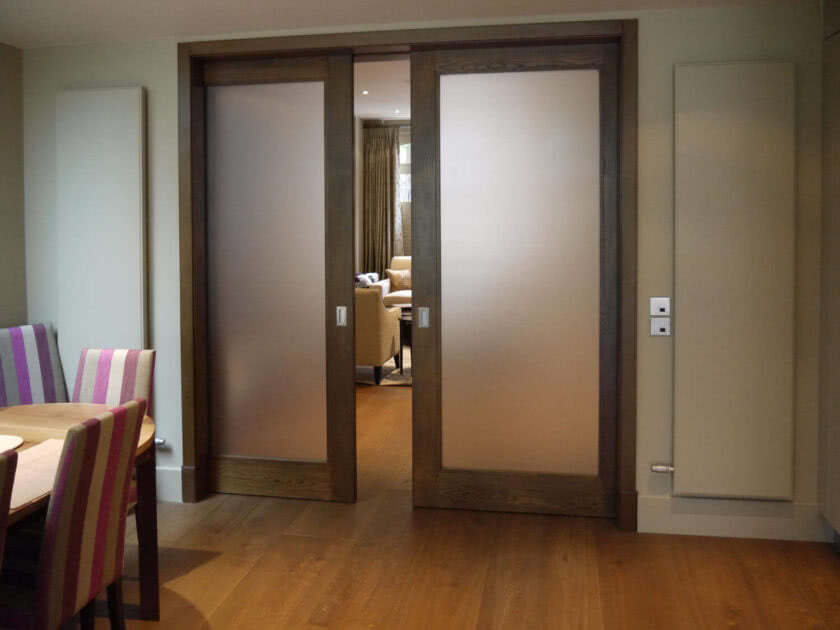 Но по большей части раздвижную створку устраивают в дверной проем. Для двери шириной от 60 до 90 см его делают одностворчатым. Если полотно доходит до 120 см и выше, конструкция получиться уже двухстворчатая. Причем каждая из них может быть или разных размеров, или полностью симметричная другой.
