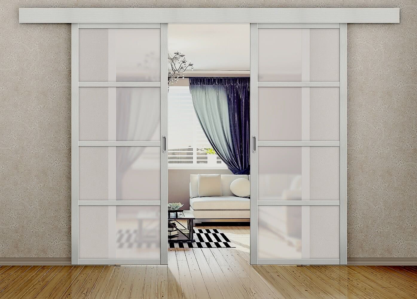 Количество панелей для раздвижной двери может колебаться в пределах от одной до восьми. В качестве дверной панели может быть использована любая дверь за исключением дверей с нестандартным профилем, к таким, например, относятся арочные двери.