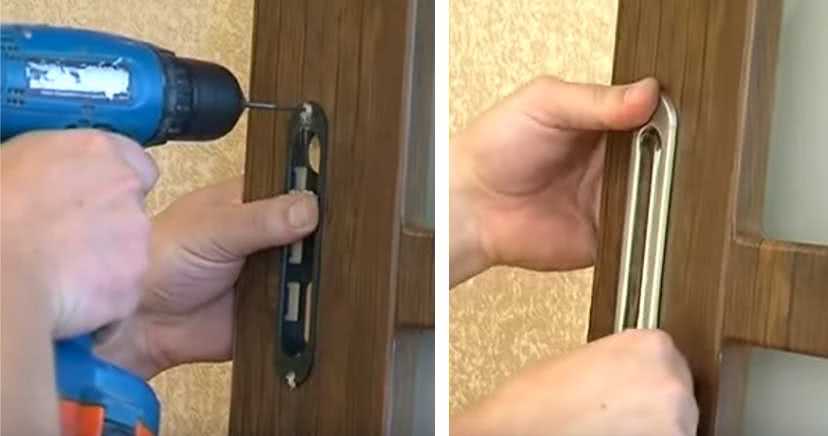 Перед тем, как полотно двери будет устанавливаться в проем, рекомендуется установить замок и ручки. В данном случае используются специальные элементы фурнитуры врезного типа. Если в комплект поставки дверного блока входят ручки и затворные механизмы, тогда под них уже подготовлены места установки.