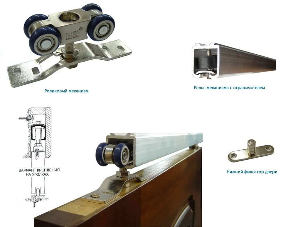 - Роликовый механизм. При его покупке обязательно проконсультируйтесь с продавцом в магазине. Фурнитура должна выдерживать вес двери, и соответствовать ширине полотен.